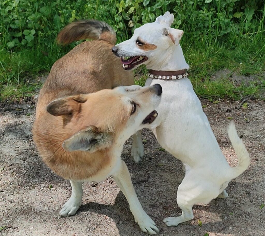 Ich lege großen Wert darauf, dass die Hunde in ihrer eigenen Sprache kommunizieren dürfen. Deswegen darf es sein, das auch, entsprechend der Situation, geknurrt, zurechtgewiesen, animiert oder auf Abstand gehalten wird, solange es angemessen ist.